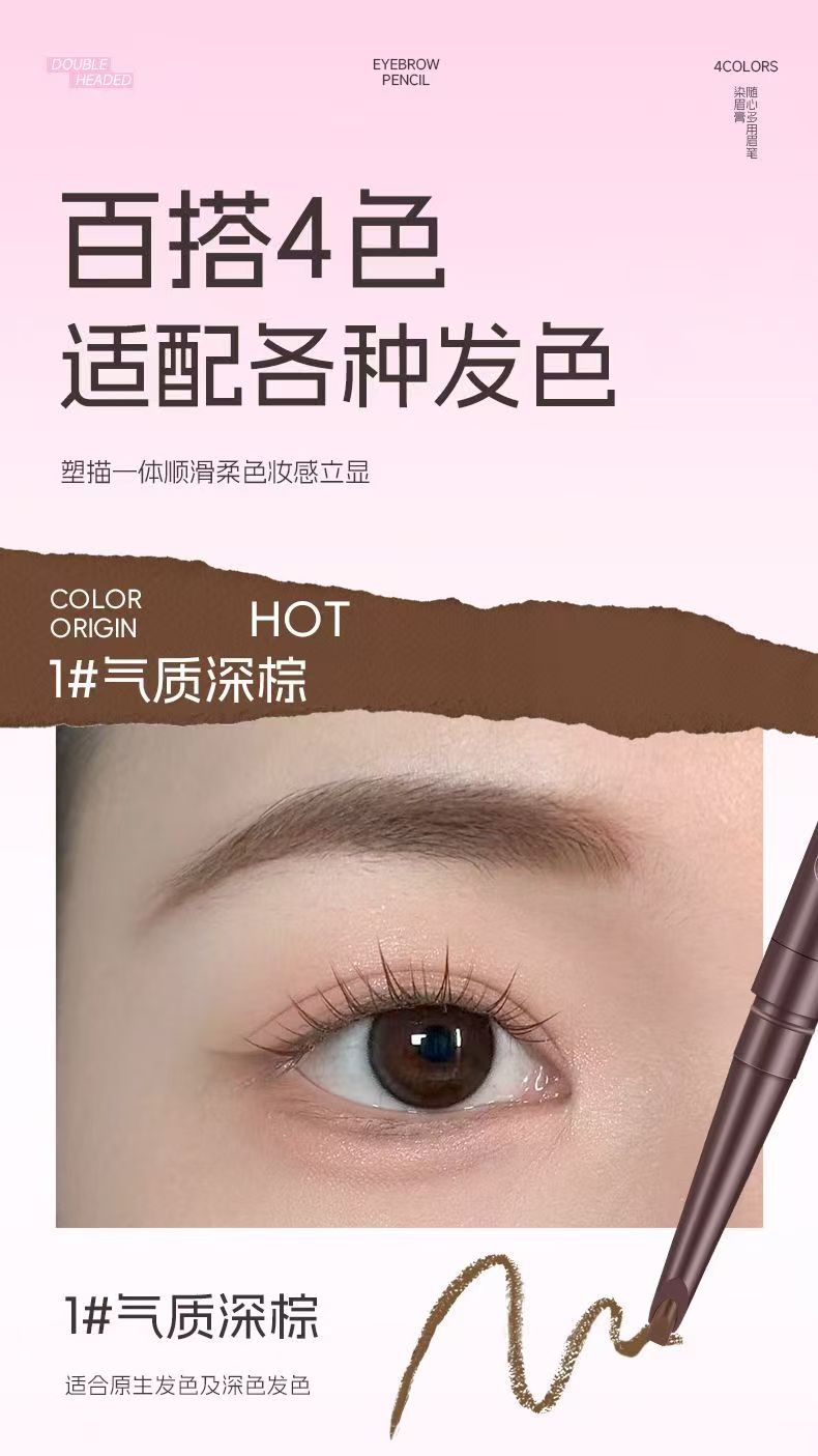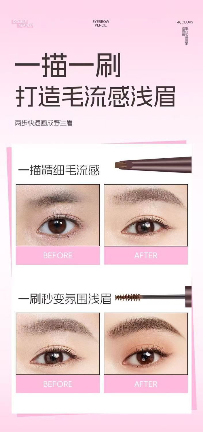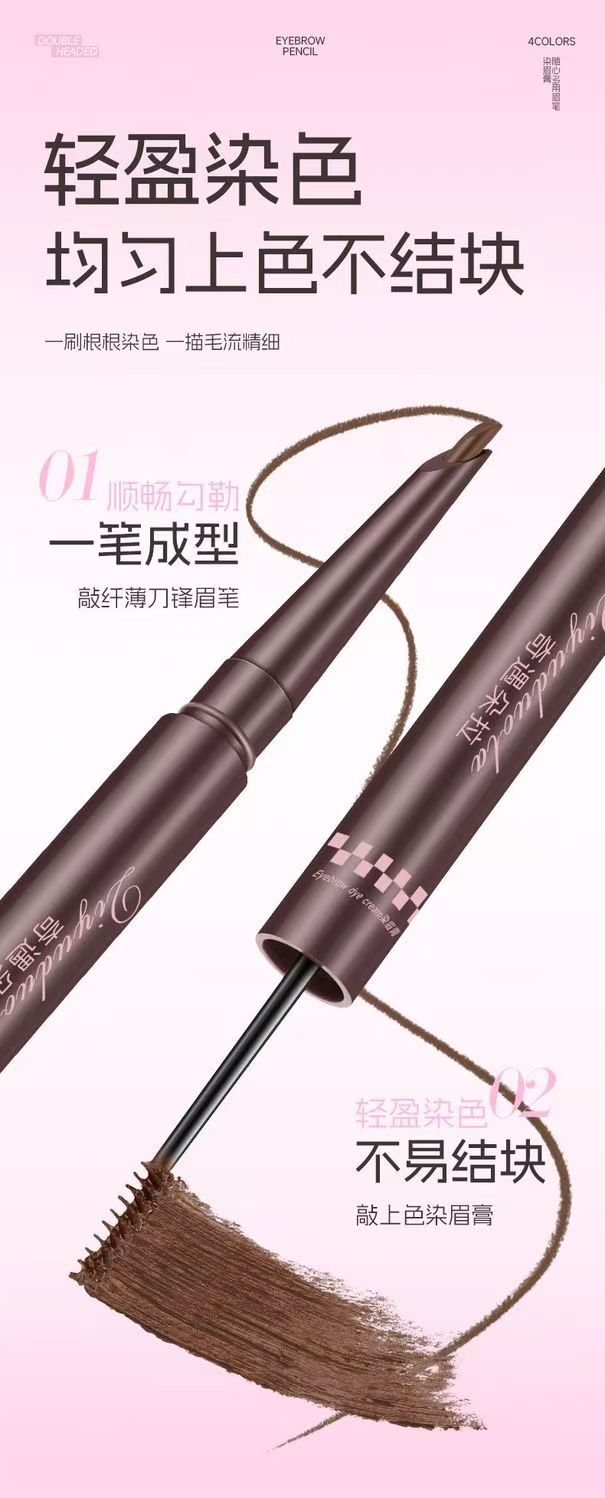雙頭雙效設計,眉筆精準勾勒眉形,染眉膏均勻填充上色,一筆搞定自然毛流感,不結塊,持久顯色不暈妝