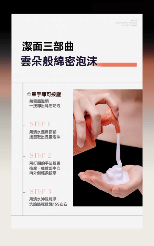 一按出泡超方便,綿密泡沫像雲朵般柔軟,溫和包裹肌膚,純氨基酸表活配方,深層清潔油脂、黑頭、殘妝,不傷膚屏障