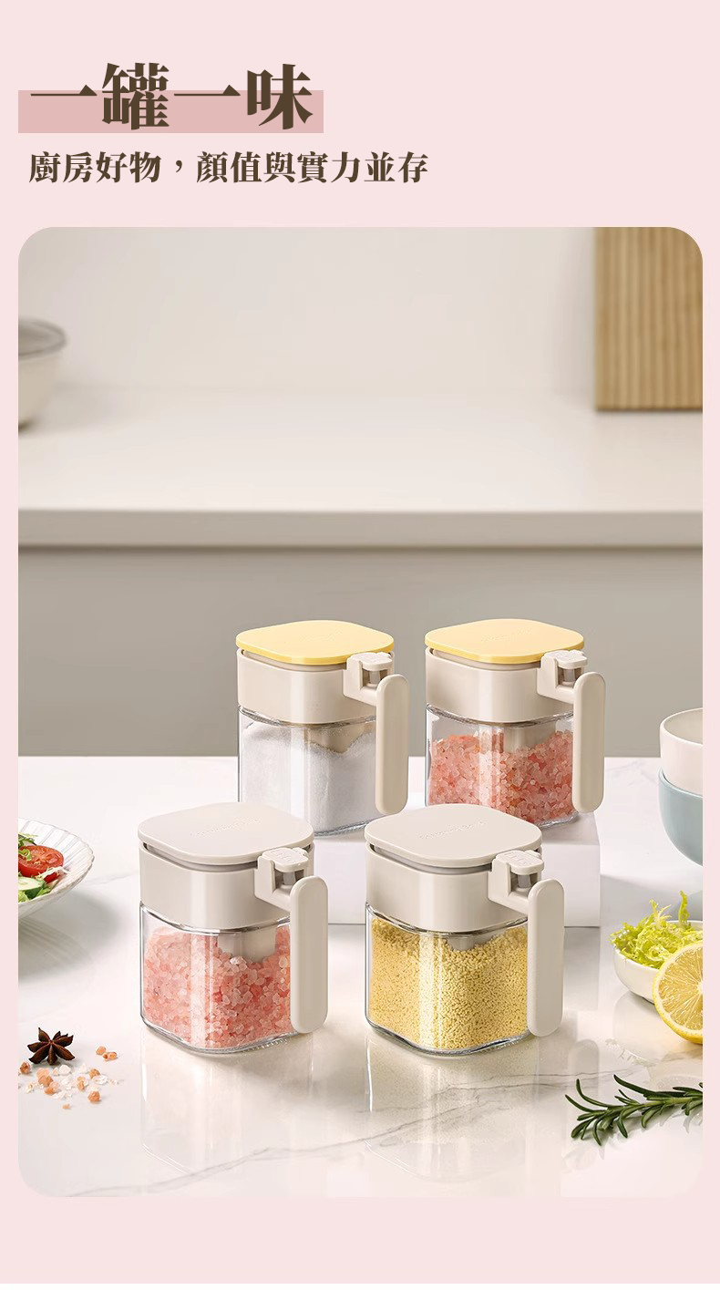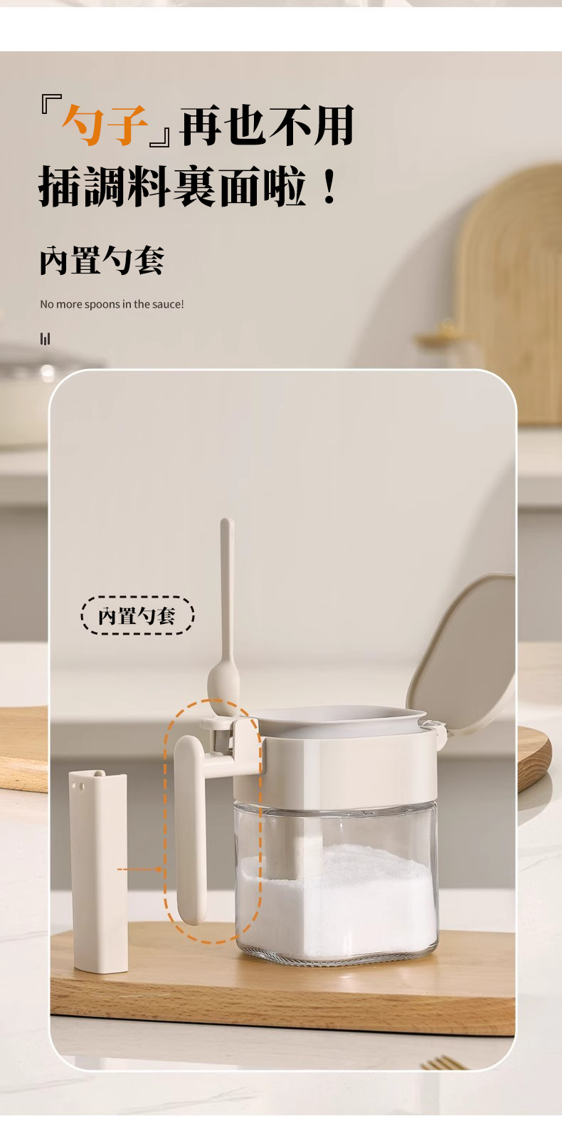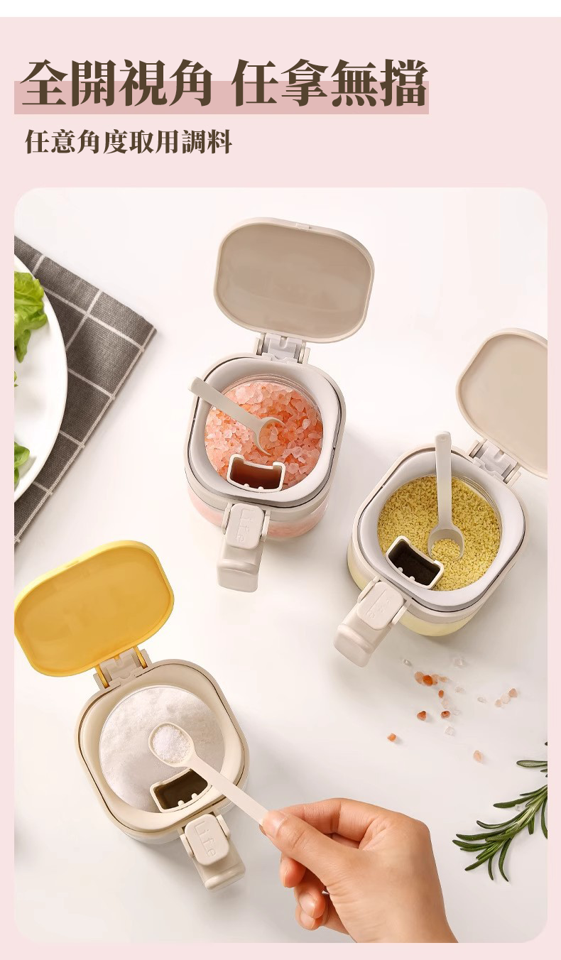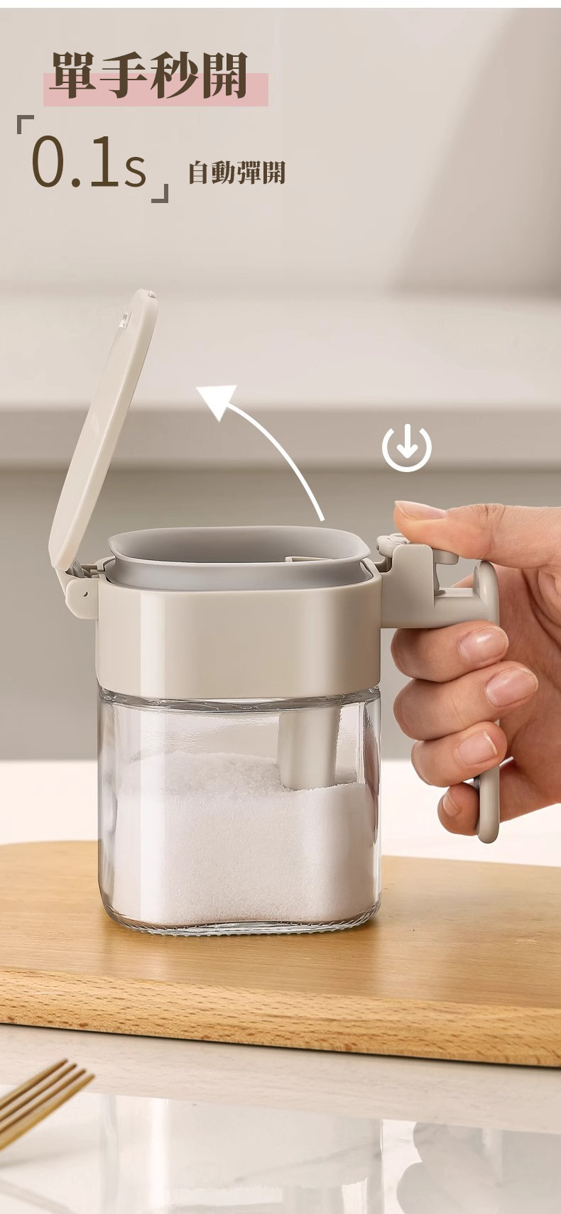 獨立小勺收納,一罐一勺,防止串味,雙重出鹽方式,定量或自由,精準掌控