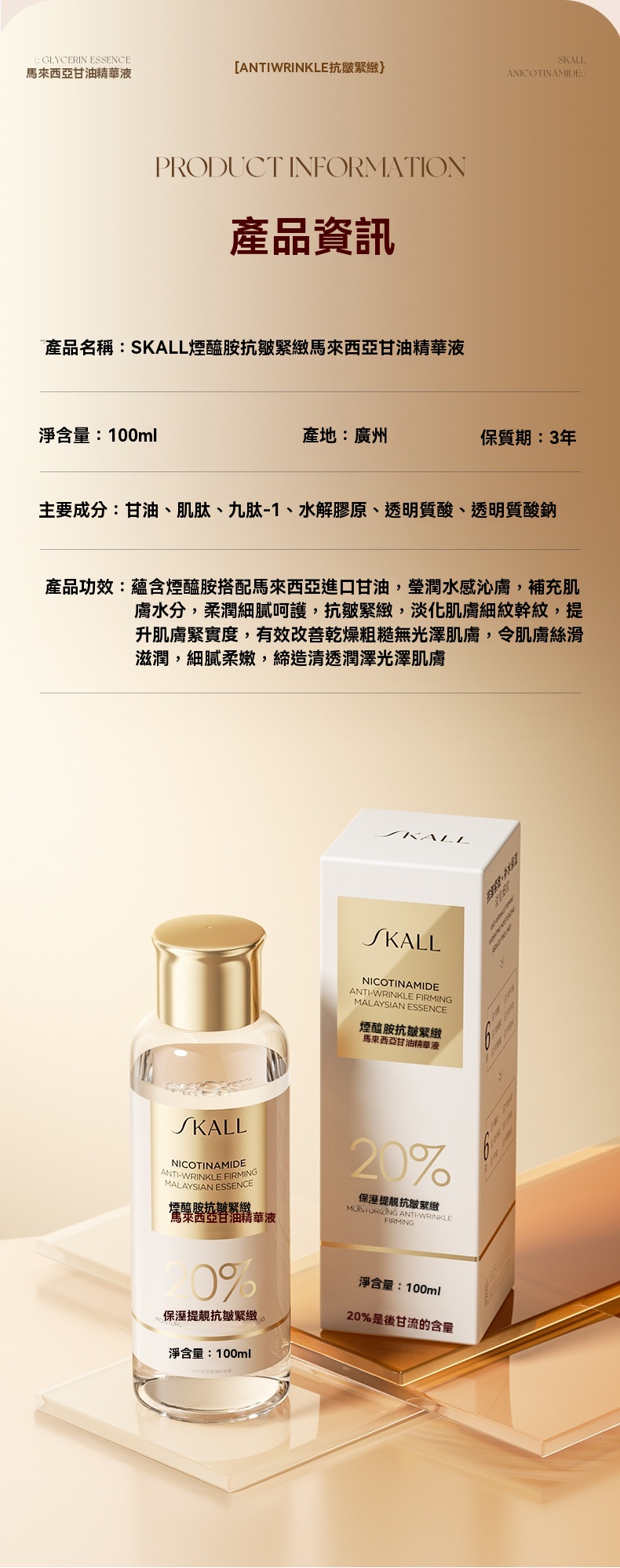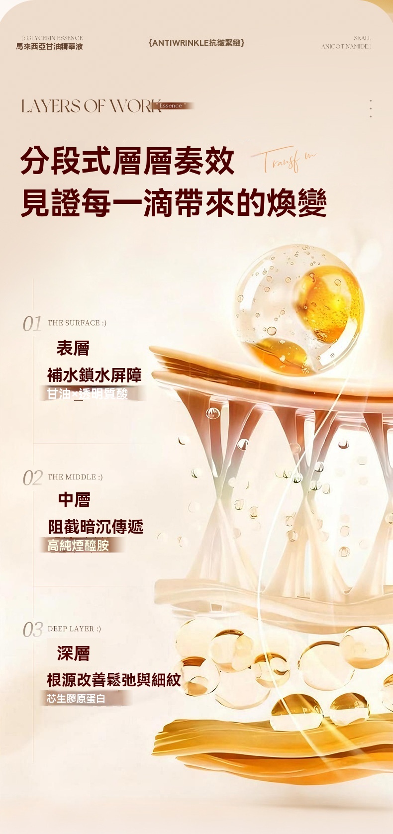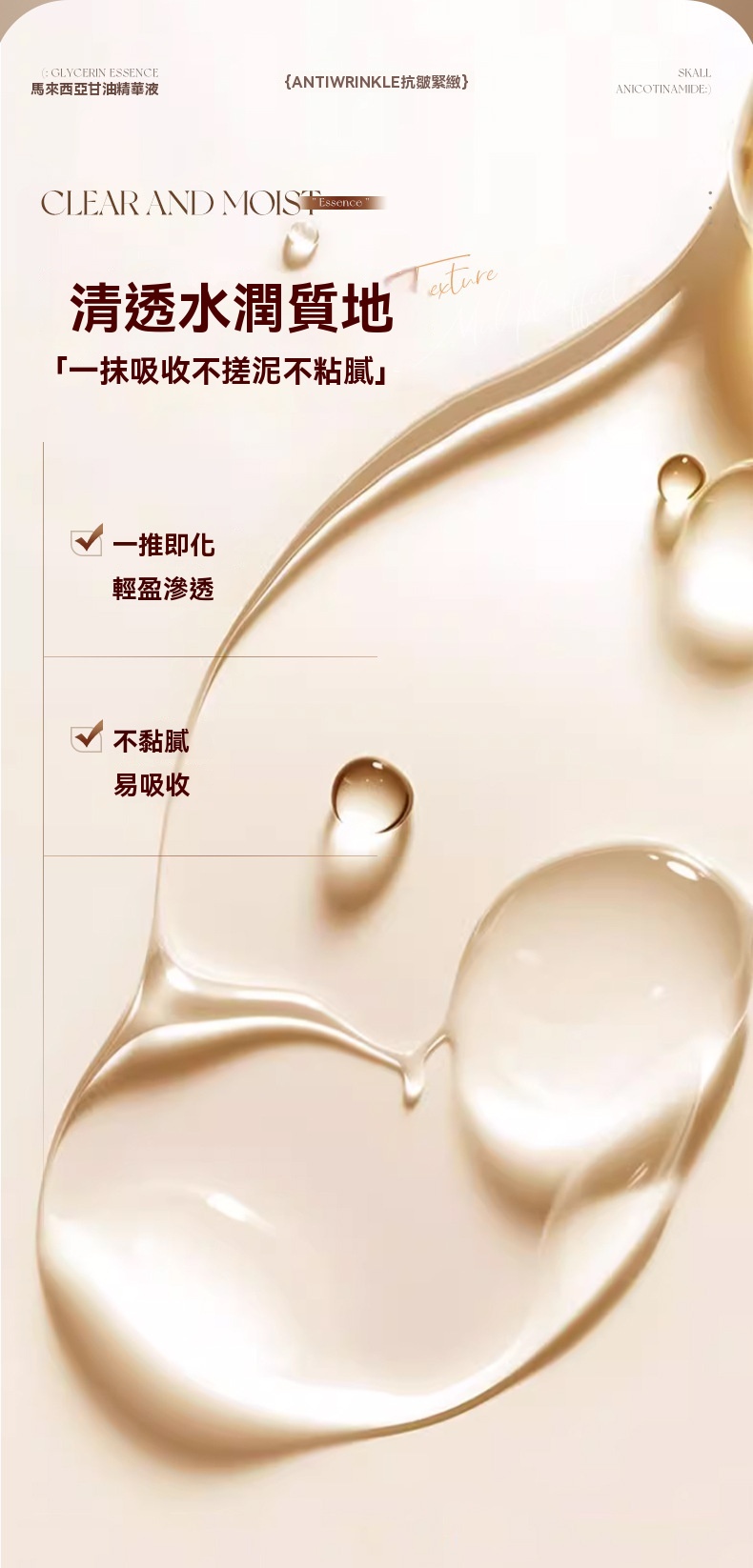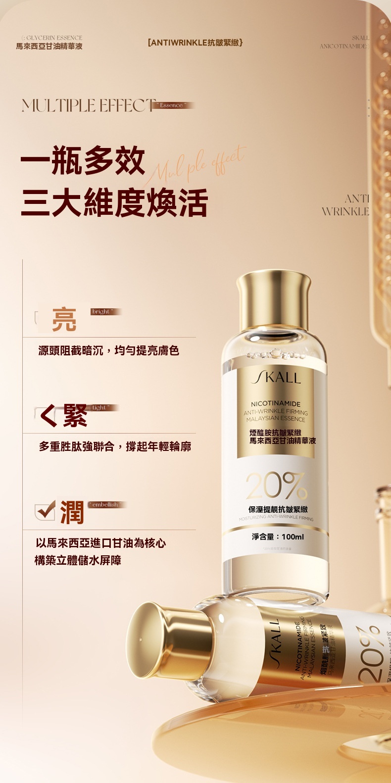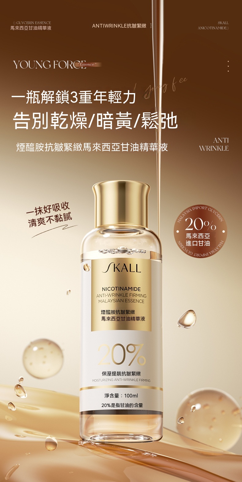 20% 馬來西亞進口甘油 + 菸鹼醯胺,一抹化水好吸收,清爽不黏膩,乾紋暗沉一次搞定,三重年輕力:深層補水 + 提亮膚色 + 緊緻抗皺,熬夜後濕敷 5 分鐘,皮膚立刻透亮回彈